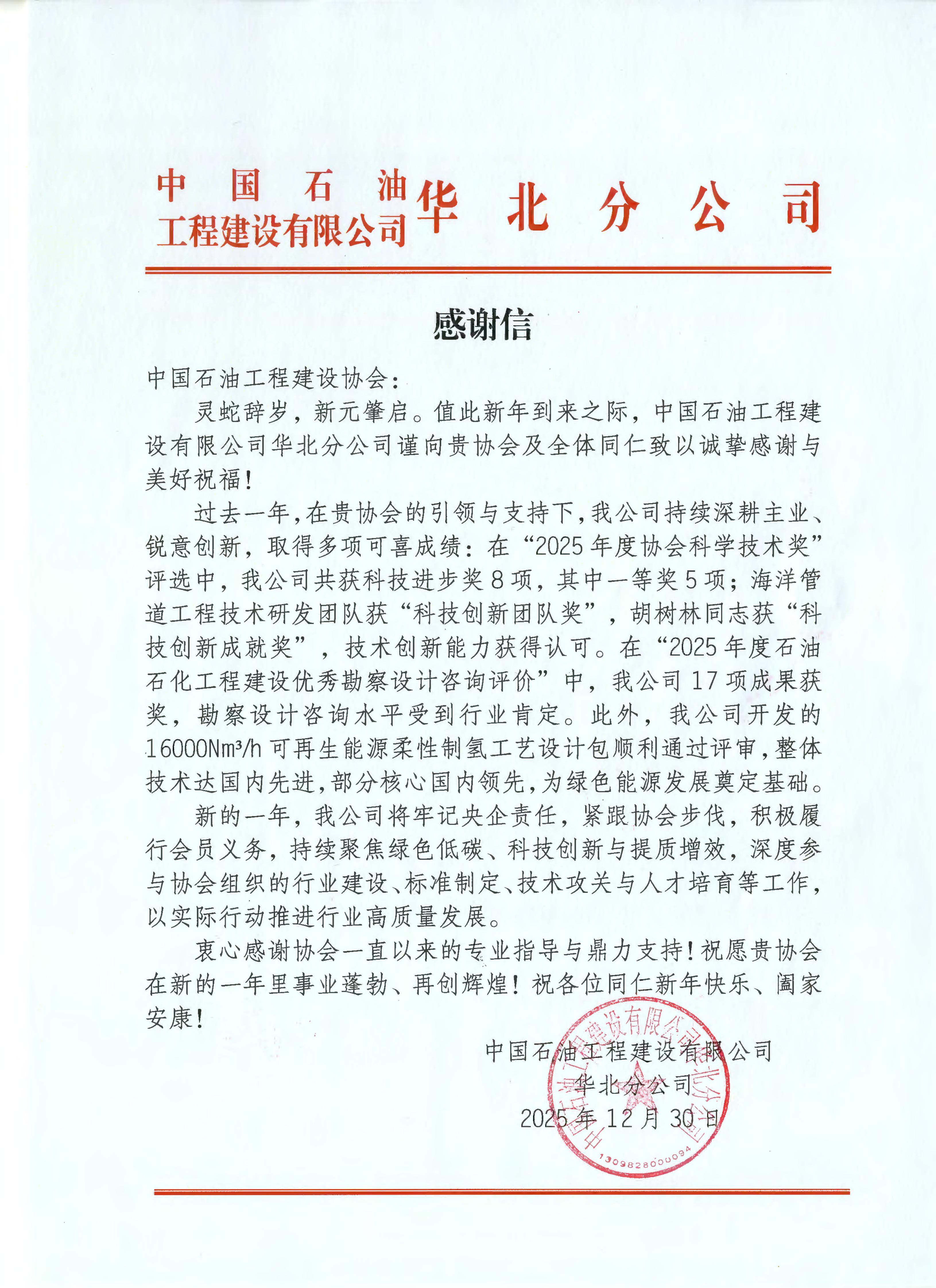 中国石油工程建设协会收到常务理事单位中国石油工程建设有限公司华北分公司发来的感谢信