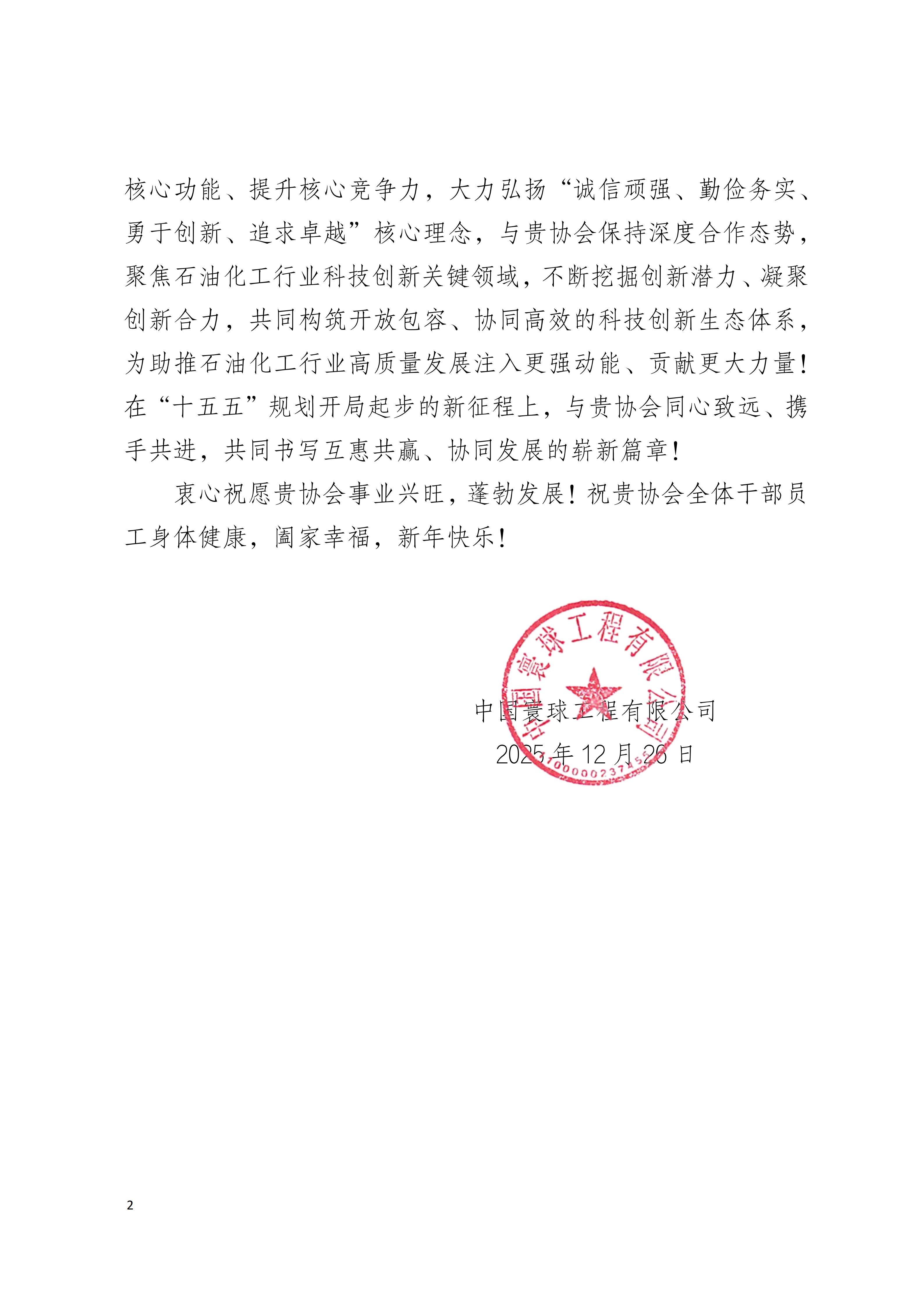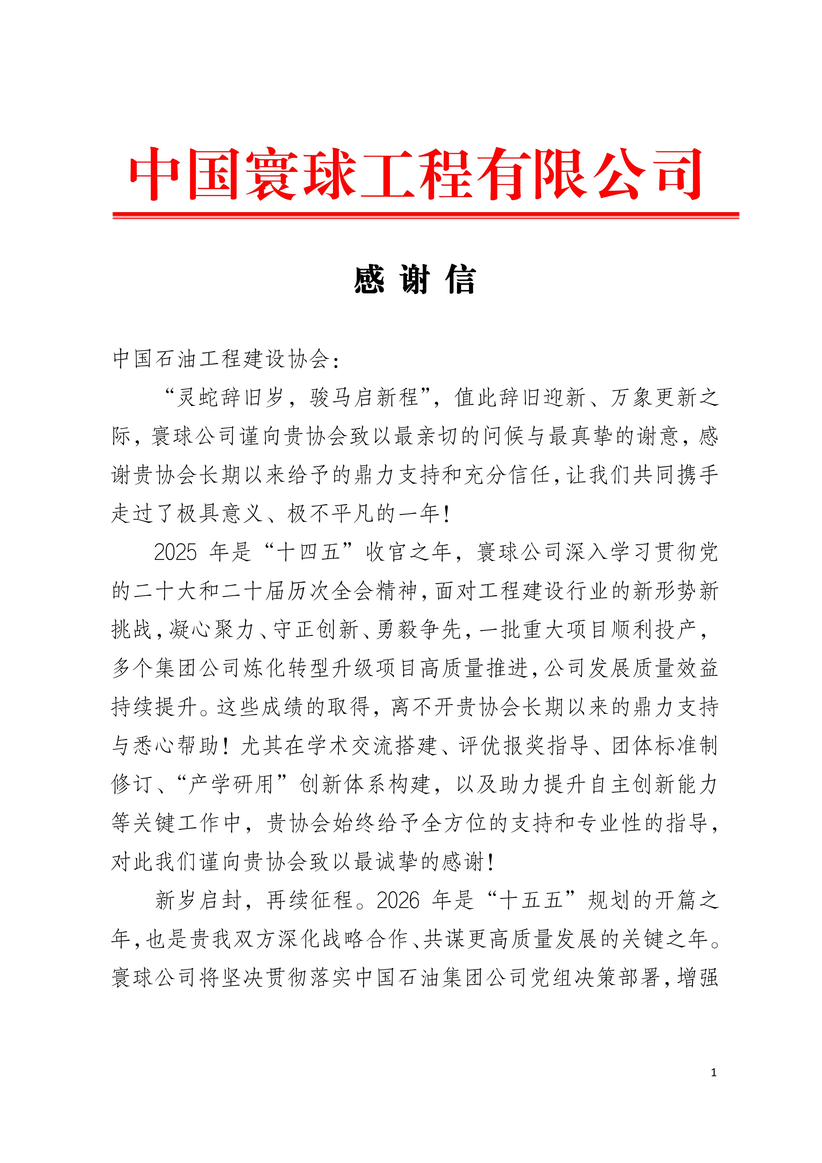 中国石油工程建设协会收到副理事长单位中国寰球工程有限公司发来的感谢信
